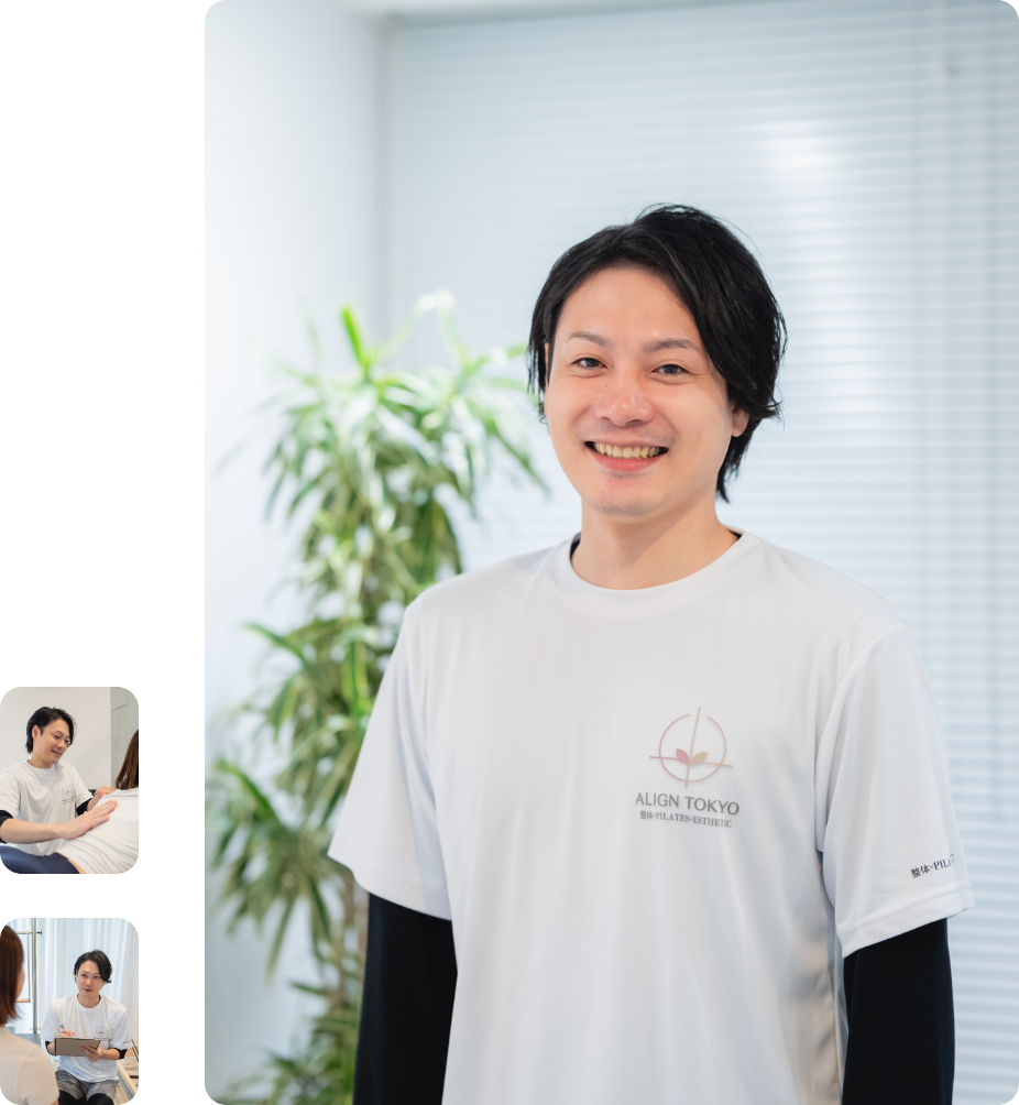 皆様はじめまして。代表の川田です。「痛みをとる、整える、鍛える、癒す」本質的なケアを自由に選べる場所として、すべての方に“ALIGN(調和)”を届けることを理念としています。国家資格を持ち、15年以上にわたり多くの患者様と向き合ってきた経験を活かし、ピラティスと整体を組み合わせた施術を通して、今のあなたに合った根本改善をご提案いたします。